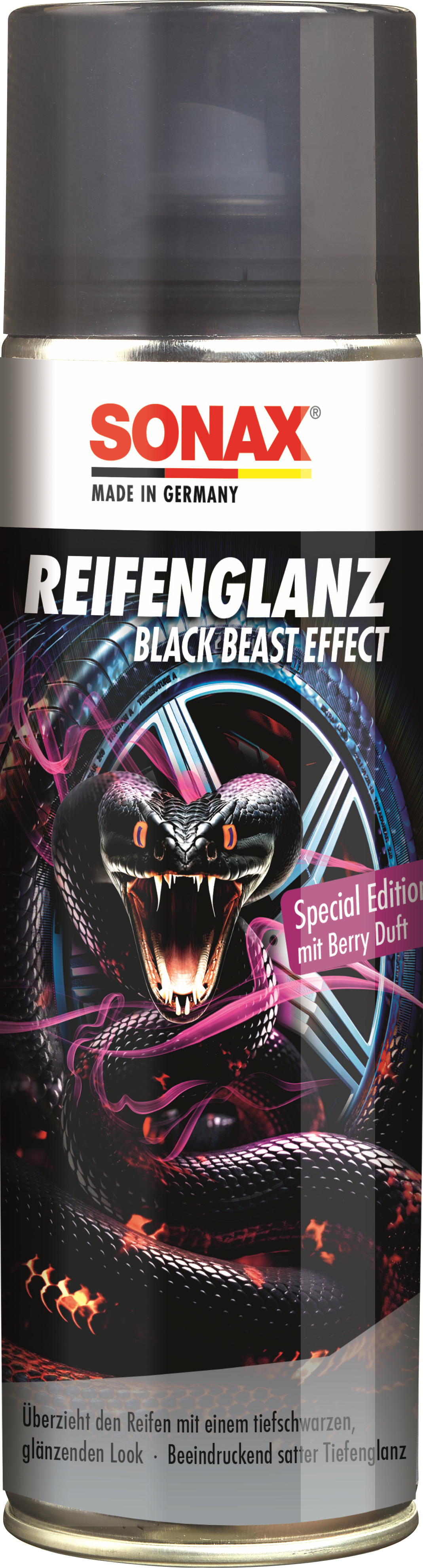 Der ReifenGlanz für ein perfekt, tiefschwarzes glänzendes<br>Doppelt anwendbar: Beseitigt mühelos Kondenswasser von der<br>Finish im Handumdrehen! Schluss mit Rissbildung,<br>Scheibe (gelbe Seite) und sorgt durch die hohe<br>vorzeitiger Alterung und Ausbleichen, der Gummi wird bei<br>Aufnahmefähigkeit auch bei starker Nässe für ein streifen-<br>regelmäßiger Anwendung gepflegt und geschützt. Der<br>und schlierenfreies Ergebnis. Die blaue Seite hinterlässt<br>glänzende Look legt sich mehrere Wochen um den Reifen.<br>einen dünnen Film mit Antibeschlagwirkung.<br>Super einfach anzuwenden: aufsprühen, einwirken lassen,<br>fertig! Für alle Reifenarten geeignet. Mit fruchtigem<br>Berry-Duft.